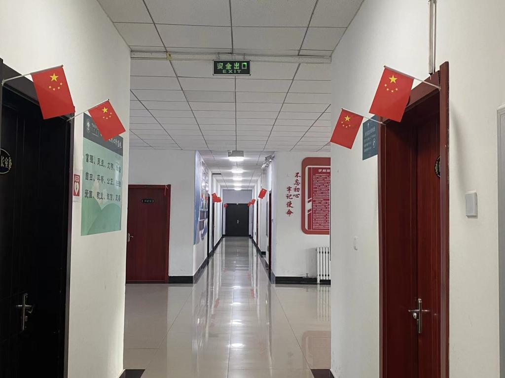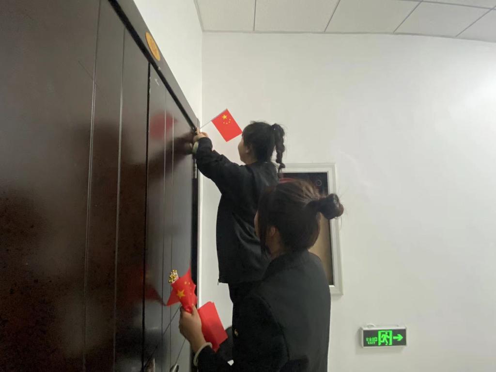 随后,同学们有条不紊的为每个办公室门上面悬挂国旗,营造喜庆、祥和、浓郁、热烈的节日氛围。