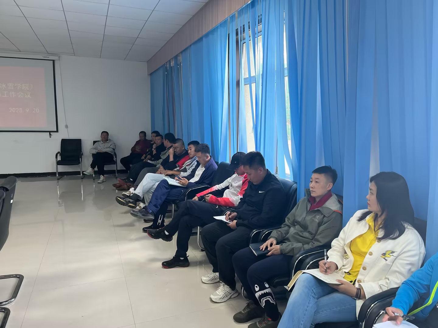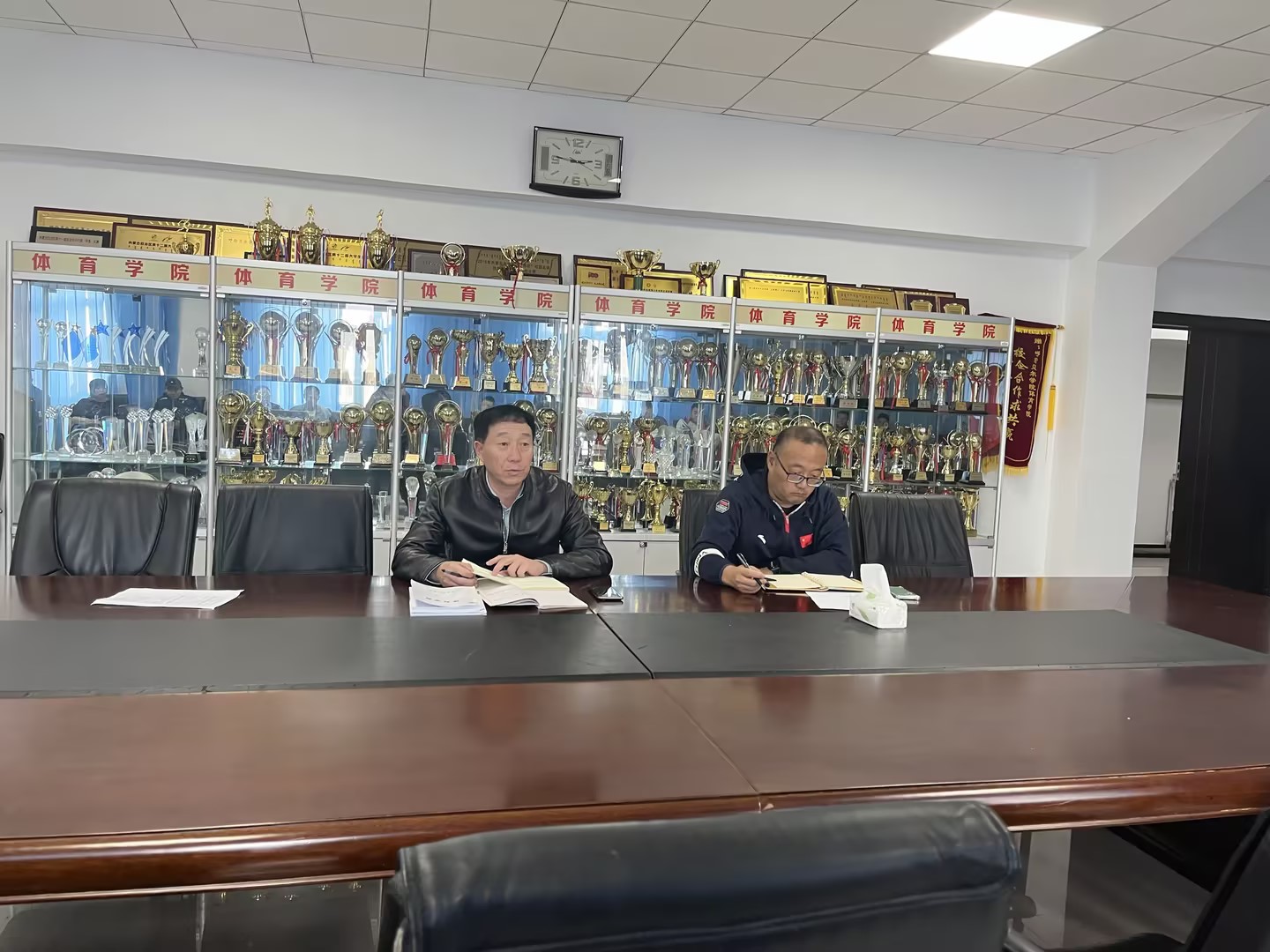 9月20日下午,bevictor伟德官网于东山体育场二楼会议室召开全体教师工作大会,体育公司党总支书记胡日查、副经理林剑冬出席,全体教师共同参会。
