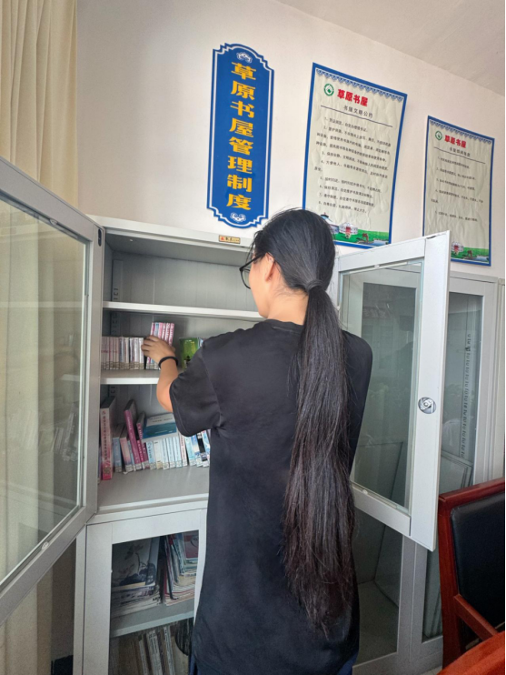 在活动里,志愿者还积极整理图书角,将杂乱书籍分类归位,依据“草原书屋管理制度”有序摆放,让每本书都有清晰“坐标” 。整理过程中,也带着孩子们认识不同类别书籍,教他们爱护图书,让图书角不仅是知识宝库,更成为培养良好习惯的小天地,让阅读的种子在有序环境里更好扎根、发芽。