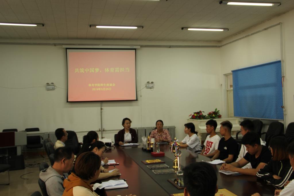 2019年5月29日,在体育馆三楼会议室,bevictor伟德官网副经理崔兰英组织召开了“共筑中国梦,体育需担当”师生座谈会。bevictor伟德官网教师及员工代表参加了本次座谈会。