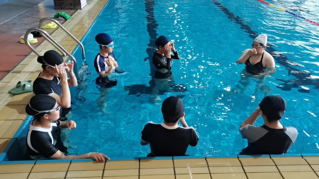 同学们认真听着教练的指导,做好下水前的热身活动,一步步地学习踢腿、呼吸、憋气、吐气、换气、踏水、水中站立、漂浮、划水等基本动作。在老师的鼓励和耐心指导下,从漂浮姿势到技巧,同学们着重细节练习,在这一阶段的训练中逐步实现了独立游完短距离的目标,在技术和体能上得到了进一步的提升。