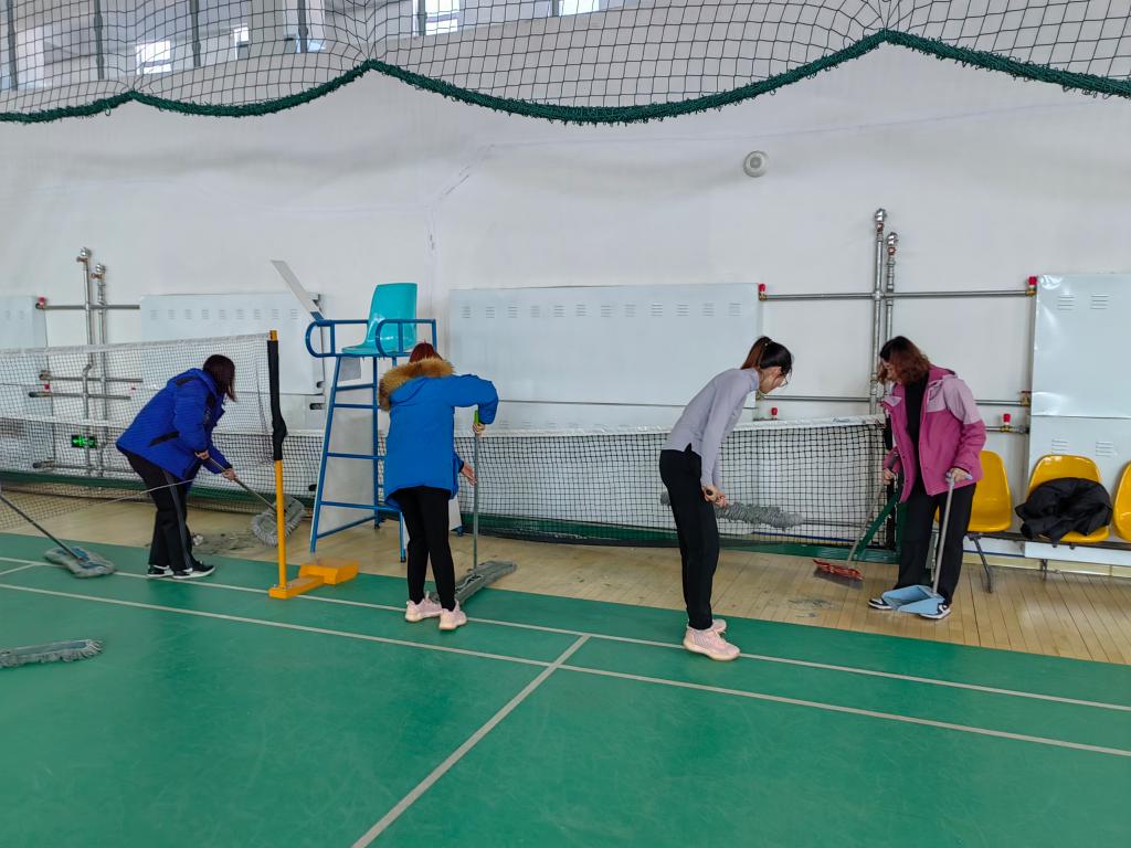 各党支部的党员结队来到山下体育馆篮球排球区、网球区、体操综合区、跑廊、看台,东山田径场体质测试区、健身运动区,足球馆羽毛球运动区、篮球场、足球场、乒乓球区及楼道看台区,手拿扫帚、拖把、抹布、塑料袋,清扫杂物、清理灰尘、捡拾烟头、清理污痕,并将清理出的垃圾、污物拣拾到塑料袋里运送到垃圾桶中。在劳动过程中师生们净化环境的热情高涨,活动持续了一个多小时,换来了运动环境的整洁一新。