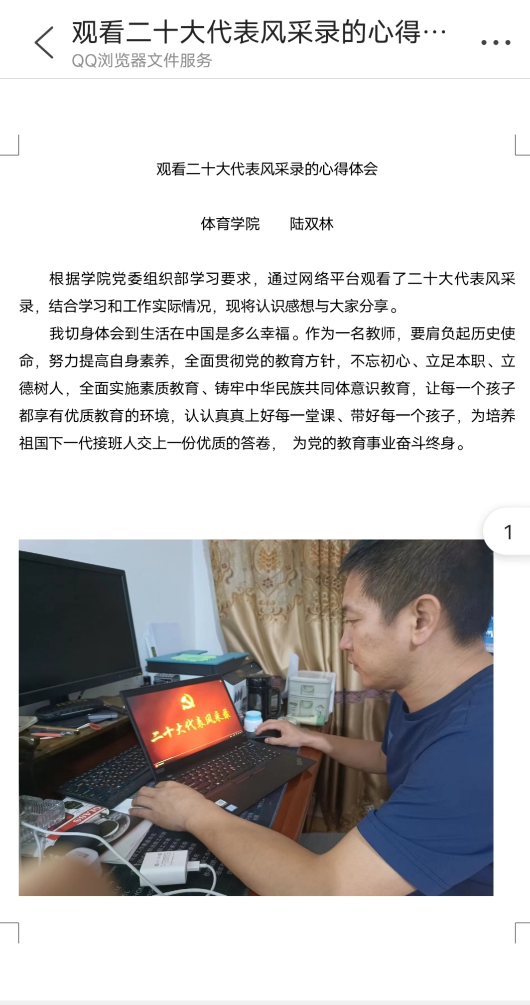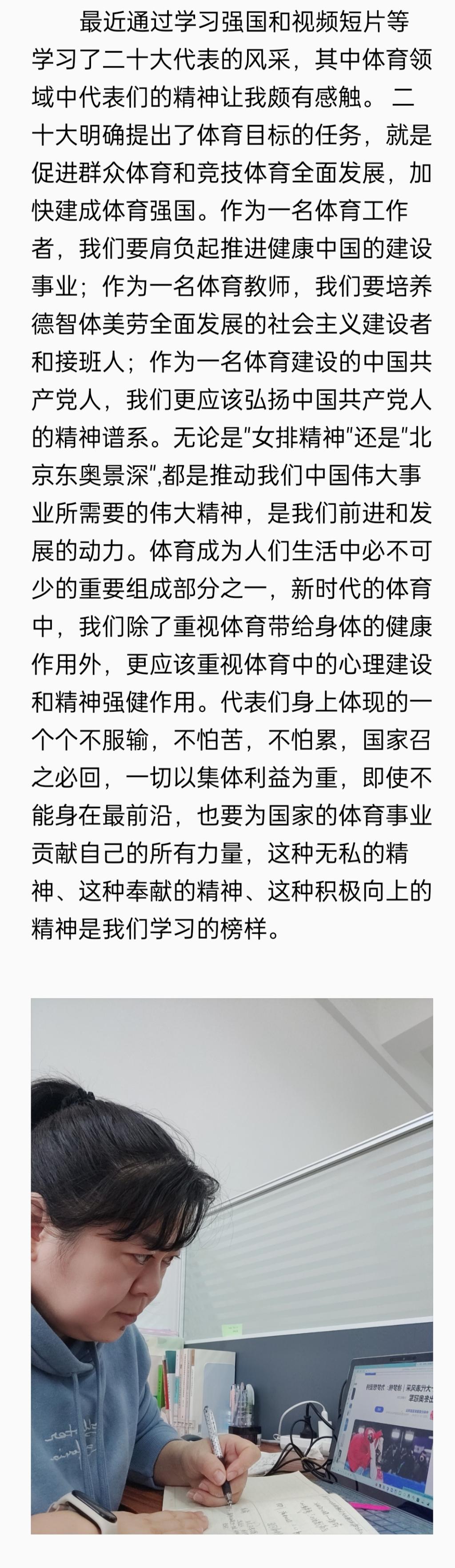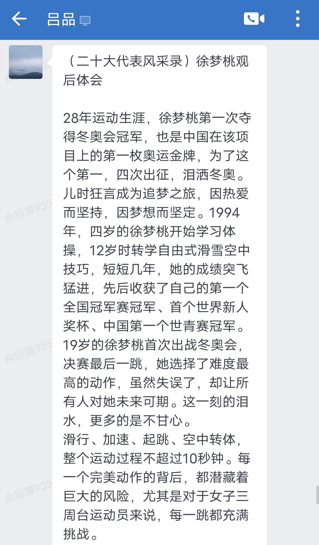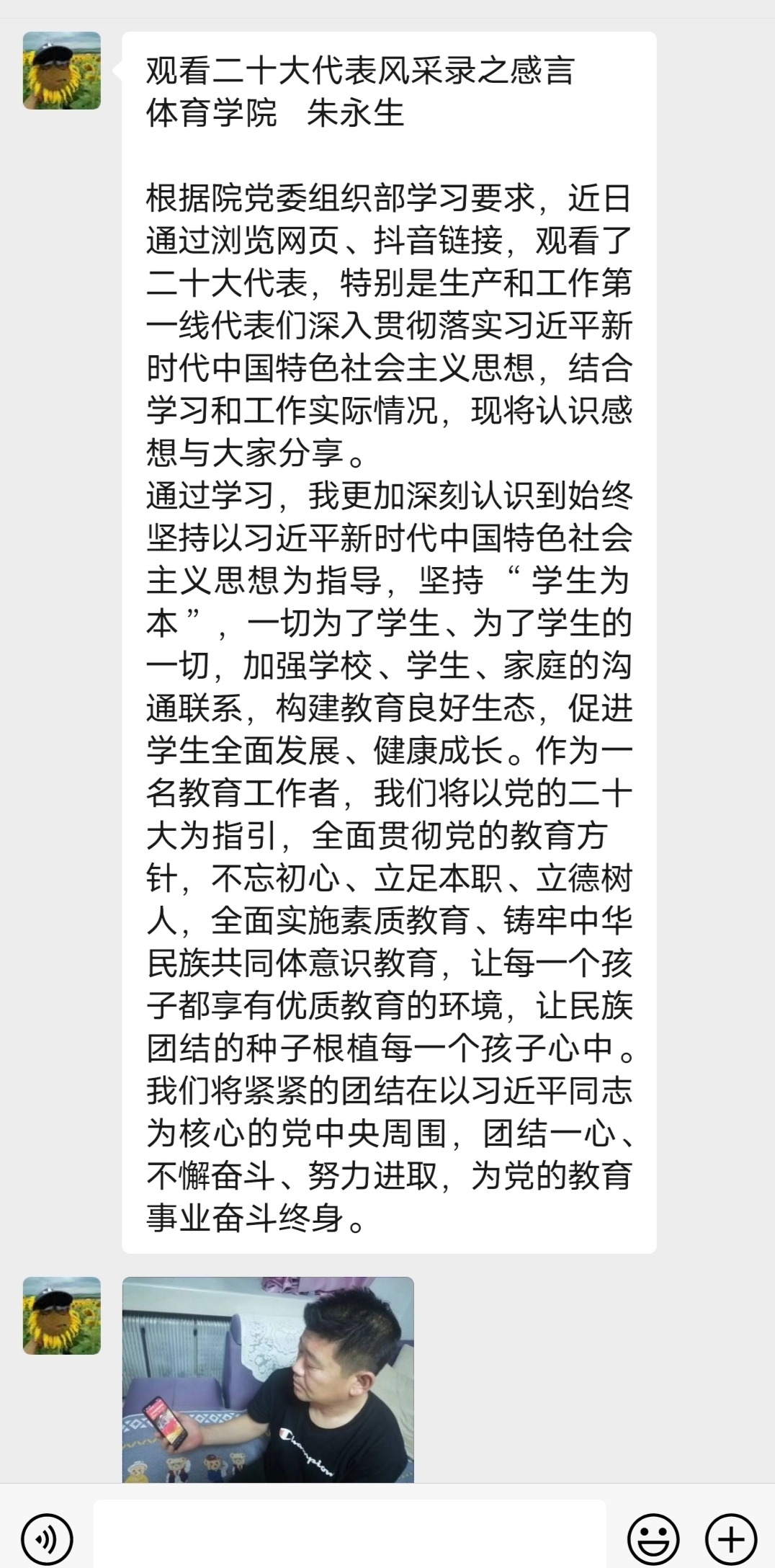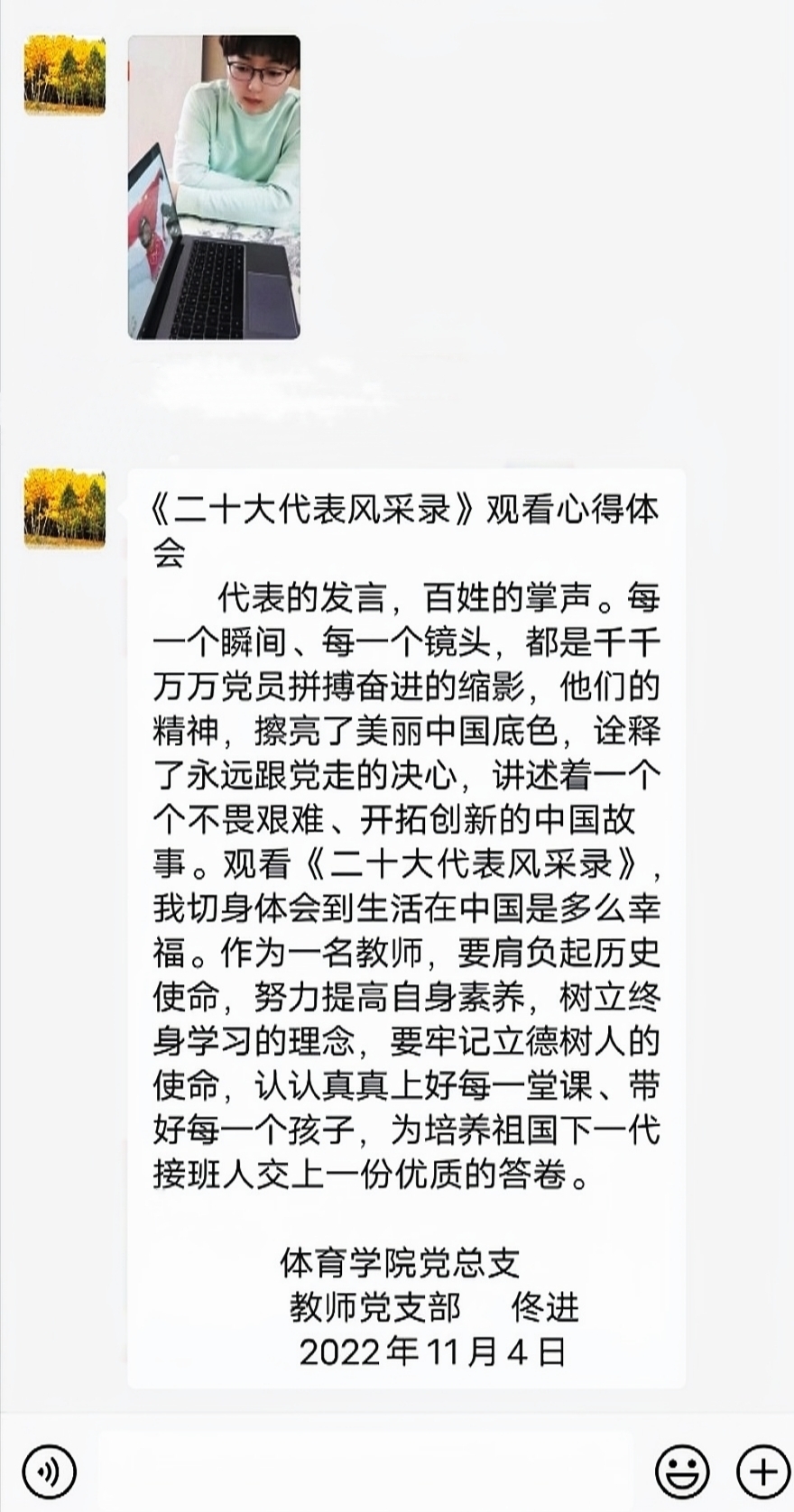 因疫情原因,连日来,bevictor伟德官网教师党支部党员就“二十大代表风采录”进行了线上交流,谈了自己的心得体会,大家纷纷表示,将以二十大党代表为榜样,向党代表看齐,不断学习和弘扬党代表展示的为民精神,立足实际、立足本职分享收获体悟,用更加务实的作风和更加扎实的行动践行共产党员的初心和使命,为体育发展的最高战略目标“体育强国建设”作出贡献。