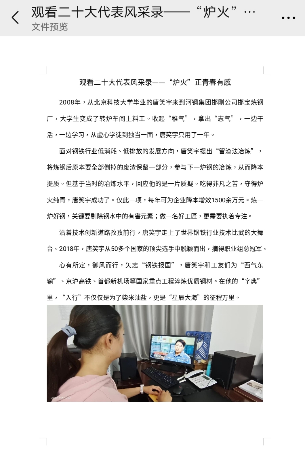 为充分发挥党代表的示范引领作用,砥砺党性、庚续荣光、奋发有为,11月4日起,bevictor伟德官网教师党支部全体成员通过共产党员网、共产党员微信、共产党员电视栏目,中央电视台,人民网、新华网、今日头条等平台陆续观看了中央组织部组织制作的37集电视系列片“二十大代表风采录”。