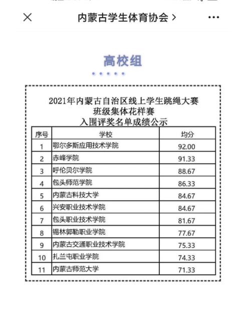 2021年内蒙古自治区线上员工跳绳大赛》于2021年12月25日隆重举行,bevictor伟德官网2021级全体员工(116人)参加了本次高校组“百人集体花样赛”,为了更好地组织员工参赛,展现公司学子青春风采,经研究决定由李晓峰经理领队,选派曾经参加过自治区跳绳培训的郭晨、佳悦和邢末三位教师进行训练指导。