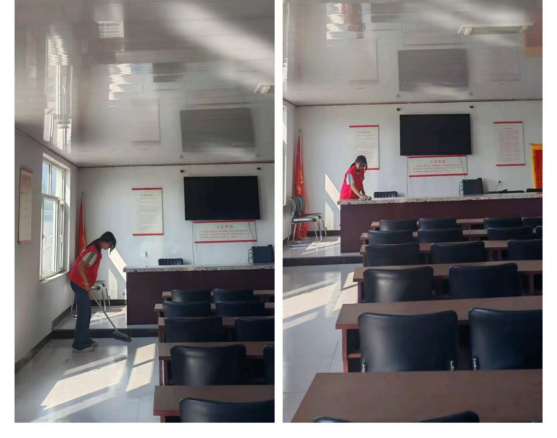 除了岗位事务,李羽鑫还负责村委会公共区域的卫生清洁。对会议室进行清扫,用扫帚清理地面灰尘与纸屑;随后擦拭会议桌椅、窗台及靠墙的书柜;这些工作虽简单,却为村干部办公、村民议事提供了整洁有序的环境,也让她体会到基层工作中“细节见责任”的意义。